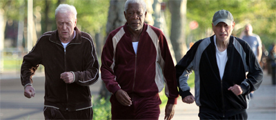 This image might just encapsulate Going in Style, a very light and fluffy bank robbery film about a trio of senior citizens who embark upon a bank robbery in order to balance the books. The movie is consciously (occasionally suffocatingly) feel good story of a bunch of cynical wise-cracking pensioners embarking upon wish fulfillment revenge against the banks that have taken so much from hard-working and decent Americans. Think of it as Hell or High Water that swaps the moral ambiguity for a clumsy score.