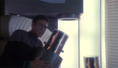 To be fair, there are shades of this weird science b-movie aesthetic to be found in the first three seasons of Star Trek: Voyager: the “gee whiz” alien abduction story of The 37’s, starring a bona fides historical celebrity; the communist era body-snatching of Cathexis; the gigantic viruses in Macrocosm; the space elevator in Rise; the evil twin in Darkling; the reverse-aging of Innocence; the killer surrealist dream clown in The Thaw; even the split/conjoined personality stories in Faces and Tuvix.