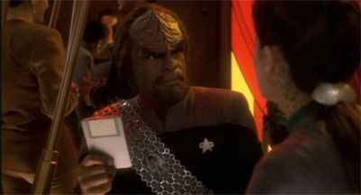 (It is interesting to not how carefully One Little Ship hews to these tropes and conventions, even in its smaller plot points. One Little Ship is the rare episode where the crazy science cannot be attributed to some freak outside occurrence – the magnetic dust in The Enemy Within, the ion storm in Mirror, Mirror, the disruption field in Second Chances, even the sabotage in Our Man Bashir. The runabout in One Little Ship is intentionally shrunk, with Worf even making a big deal of how the research would grant them “a substantial tactical advantage over the Dominion.”)