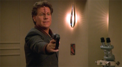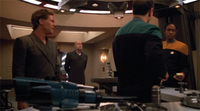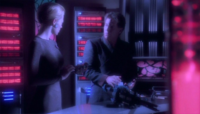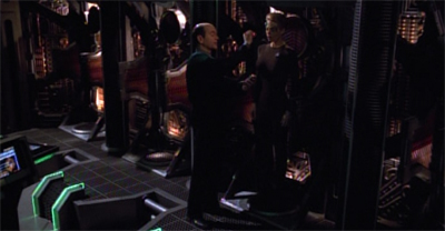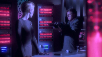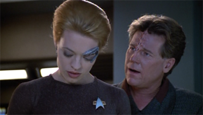 Another odd thing is Seven’s sudden turnaround in the last act. Even when confronted with evidence that blows her story right out of the water, Seven is adamant and refuses to give up her pursuit of Kovin. But when Kovin kills himself in a rash attack on Voyager, Seven suddenly sees the light and confides in the Doctor how guilty she feels. I always feel like there’s a whole section missing in the last scenes.