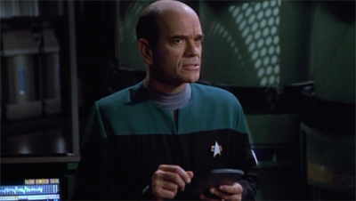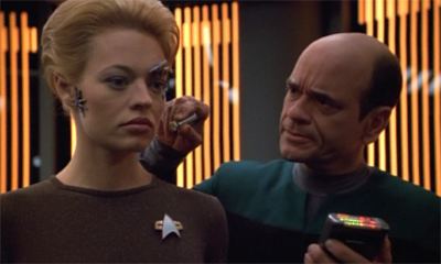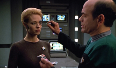 In short, the EMH is a self-trained quack who is not a professional psychiatric therapist. The EMH has no idea what he is doing when he tinkers with Seven of Nine’s memories, as much as he can rhyme off psychobabble about a hypothetical “Jungian therapist” or “Amanin of Betazed.” Even allowing for the delicate nature of regression therapy and his own inexperience, the EMH makes a point to improvise. “I’ve integrated the finer points of both to create my own approach to memory reconstruction,” he assures Seven. It all seems like an act of righteous hubris.