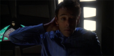 Of course, Sadler is misremembering. Sloan is never glimpsed inside Bashir’s quarters in Inquisition. Sloan reintroduces himself to Bashir in that manner in Inter Arma Enim Silent Leges and Extreme Measures, and that is how most casual viewers will remember him. Sloan perched at the end of Bashir’s bed is an evocative image, one that captures the essence of the character.