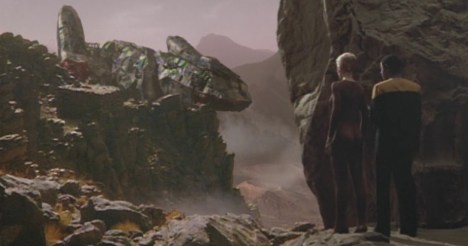 More interesting is the elevation of Voyager into something of a legend in the Delta Quadrant, tying together the series’ interest in the malleability of history and its aspirations towards generic Star Trek. There is a sense that the characters driving the ship are largely interchangeable, and that there is something almost archetypal about the crew’s journey. The third season set up this theme, with Voyager entering into mythology at the end of False Profits and into speculation at the start of Distant Origin.