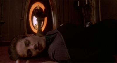 Jadzia’s death is slightly more complicated. For one thing, it just doesn’t feel right that a Star Trek show would kill off a series regular. It doesn’t fit with the tone of DS9-for all that it has a reputation of being dark, it was quite generous with its characters’ fates. I think you could characterize the majority of them as happy endings. For that reason, even if the death was executed flawlessly, I don’t think it would have as much of an impact on me as on other shows. It’s too obviously forced by outside circumstances-the DS9 writers would never kill a character off like that.