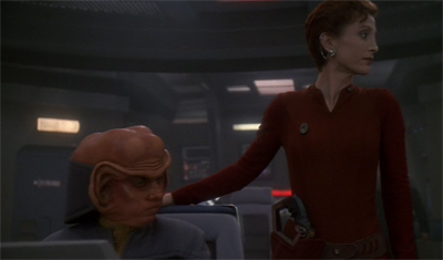 To be fair, there are parts of Tears of the Prophets that work very well. As a season finale, the episode does an excellent job checking in on the various characters and fleshing out the status quo. There are a number of guest stars who have been absent for extended periods. Tears of the Prophets marks the first appearance of Garak since In the Pale Moonlight, which makes a certain amount of sense; Sisko seems unlikely to have been wanting for his company. It also marks the first appearance of Martok since You Are Cordially Invited…