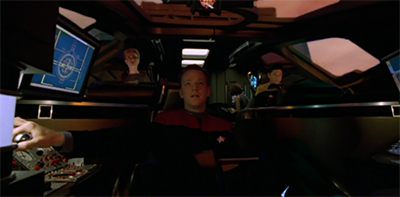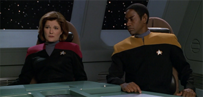 3. There is a third layer of disregard for continuity in this episode, aside from Torres’ sudden depression and Paris’ shuttle pet project. The construction of a shuttle from thin air is like some huge middle-finger to any observant fans, who have seen about a dozen shuttles get destroyed, and who have been told repeatedly that Voyager barely has the resources to replicate soup. Now suddenly they are able to produce a brand new advanced craft in a matter of days.