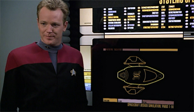 However, that is not enough of itself. The other characters then begin contributing technobabble. “Basic design elements are adequate,” Seven observes. Kim give it a little more thought. “If we used isomagnetic EPS conduits in the plasma manifold, we could maximise the power distribution,” he reflects. Even Tuvok gets in on the fun. “My shield designs could be successfully applied to a vessel of this size.” The scene is really disconcerting, as if the production team are uncontrollably excited about a this new (fictional) shuttle.