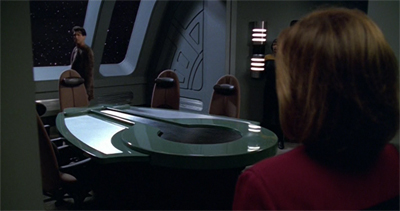 Counterpoint cleverly turns down the lighting. During the Devore inspections, Janeway sets Voyager to “grey alert”, which effectively establishes mood light across the ship. While the sets are still very clean and very shiny, the atmospheric lighting in Counterpoint helps to cultivate a sense of ambiguity and mystery. Even after Kashyk defects to Voyager, Counterpoint maintains that relatively low-key visual aesthetic. During their scene together in the mess hall, Janeway and Kashyk keep the lights turned way down low.