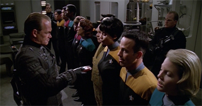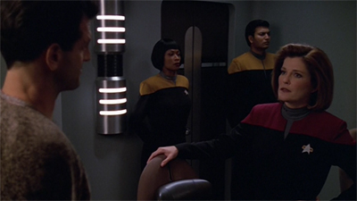 A clumsier script would have wasted time on set-up or exposition. Instead, Counterpoint begins with a powerful image and then retroactively fills in the gaps. A few lines between Kashyk and Janeway explain why these fascist thugs are rummaging around the ship, and the plot can get moving all the more effectively for not having to introduce all of these characters and then show the inspection process and then have Janeway rescue the telepaths. Having all of that set up before the episode even starts allows Counterpoint to get to the meat of the matter.
