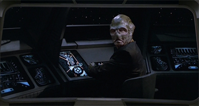 However, Torat is particularly engaging. Torat is a wormhole specialist, a member of an unnamed Delta Quadrant species. The character himself is nothing but a vehicle for exposition, allowing Janeway and Kashyk to play “good cop, bad cop”, but his design is fascinating. Michael Westmore gives Torat an eerily smooth face that recalls the Moneans from Thirty Days, suggesting the uncanny valley. However, he also give the character an air bladder under his nose, which allows him to “puff up” his face. It is a nice visual that makes even this minor character seem unique.