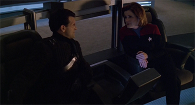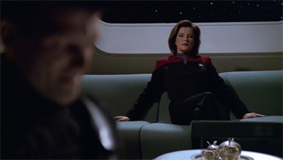 Indeed, the original plan for Counterpoint was much safer and more generic than the version that made it to screen. In early drafts of the story, the writers had planned for Janeway to fall in love with one of the refugees. This seems like a much tamer story than the finished episode, one anchored in a raw sentimentality rather than in an aggressive sexual power dynamic. Having Janeway fall in love with a space!Holocaust survivor would have been far too earnest, particularly given the necessity of writing that character out at the end of the episode.