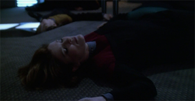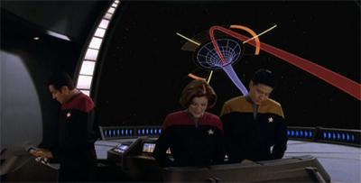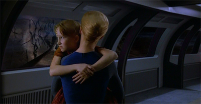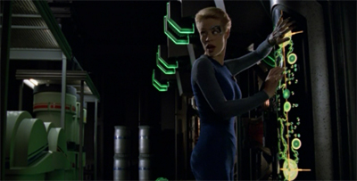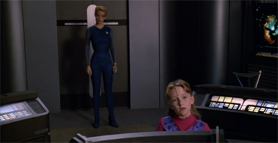 Bliss hits upon another recurring trope, positioning Seven of Nine as the character with the ability to see through these deceptions. Voyager routinely suggests that Seven of Nine has a very paranoid and cynical world view, perhaps the cast member who most pointedly reflects the values and the world view of the nineties. Perhaps this is because Seven of Nine was a late addition to the cast, making her more up-to-date. Perhaps it is because Seven of Nine was once a Borg drone, and her processing power makes her an ideal stand-in for the paranoia of the internet age.