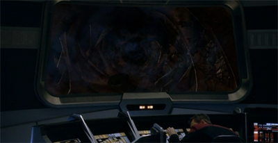 (Bliss even goes so far as to reinforce this comparison during the sequences in which Janeway pilots the ship into the entity. The organism is filmed in such a way as to suggest a gigantic space whale. Its jaws seem to close around Voyager like those of the whale from the story of Jonah. Qatai talks about the entity as something more like an animal than the living nebula in The Cloud, referring to its “primary neural plexus” and its “digestion chamber.” The literal belly of “the beast.”)