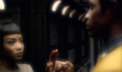 In some ways, the episode’s handling of Qatai is a major problem. Most obviously, Bliss is an episode that could use a lot more of W. Morgan Sheppard. The teaser opens with Qatai charging into battle against the space monster, but the character is largely absent from the first half of the episode. He only reappears once the crew have gone into their coma. Even then, Bliss does not know how to properly use its guest star. Qatai banters well with the surviving crew, but the script moves him off the ship at the climax, which means putting Sheppard at a remove from the action.