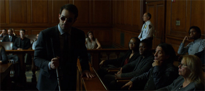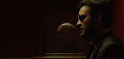 Quite tellingly, The Defenders establishes each of the characters existing in their own worlds. This is most obvious in the strong colouring choices; Matt is red, Luke is yellow, Jessica is blue, Danny is green. (Because of course Danny is green.) Even in scenes that the characters share with one another early in the run, the colouring tends to intrude and contrast. When Matt visits Jessica in the holding room in Worst Behaviour, the room is blue while the door and Matt’s folder are red. These colours bounce off one during the dinner scene in Royal Dragon, emphasising the differences in characters.