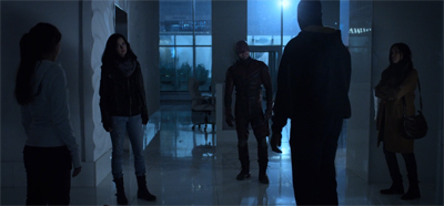 Indeed, given that “the Incident” was itself a surrogate for 9/11, it seems like “Phase I” of the Marvel Netflix shows have been bookended by invocations of the 9/11 attacks, a perhaps a reflection on the cycle of repetition. Modern pop culture in general, and the Marvel Cinematic Universe in particular, has returned time and time again to these images and these ideas, playing out various facets of the horrific event through various lenses. It makes sense that The Defenders would tie its four source shows together with a story like this.