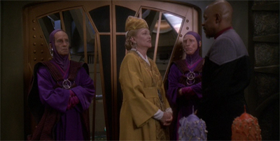 Winn finds herself confronted with the same reality in Strange Bedfellows, realising that the vision came from the Pah-Wraiths rather than the Prophets. She consults with Kira, who urges her to effectively admit her mistake and start over again. “Eminence, being in power is what led you on the wrong path,” Kira suggests, which is probably the wrong line to take in trying to negotiate down an egomaniac having a spiritual crisis. Predictably, Winn cannot admit her own errors. “I have worked too hard, waited too long to give it all up now.”