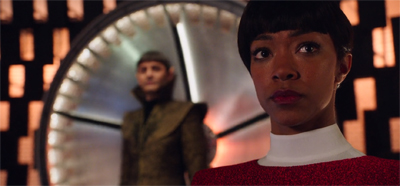 Burnham is physically separated from her mentor, as she has been emotionally separated. The transporter becames a metaphor for the trauma of separation at death, of being yanked away from a person suddenly and without warning, as if there are suddenly entire worlds between two people who had been standing right next to one another. It is a very clever and beautiful use of the transporter for emotional storytelling, fitting very comfortably with Fuller’s recurring fascination with the process of death and the transformation therein.