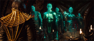 It is worth noting that Fuller reinforces this thematic connection through more than just the production design. T’Kuvma believes that he is the reincarnated form of Kahless the Unforgettable. Notably, the character is played by performer Chris Obi under layers of makeup. Obi had previously collaborated with Fuller on American Gods playing Annubis, the Egyptian god of death.