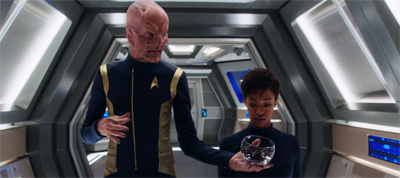 Discovery is very much about a journey towards a more conventional form of Star Trek, even though that journey is not measured in lightyears or warp factors. Even with a ship that can go anywhere, there is a sense that it is still lost. This paradox is reflected in Burnham’s closing reflection, “Sometimes down is up. Sometimes up is down. Sometimes, when you’re lost, you’re found.” Burnham has obviously been “found” by Lorca, but there is a deeper sense that Lorca himself (and maybe the entire ship or the entire Federation) is fundamentally lost.
