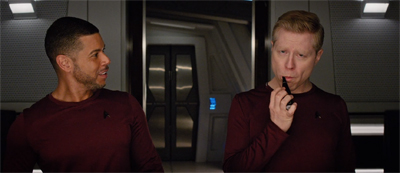 Indeed, Tilly immediately apologises for her language, realising that it is inappropriate. Stamets turns to her and hesitates a beat. After all, Stamets has been fairly effectively established to this point as something of a wet blanket. Instead of berating Tilly, Stamets smiles. “No, cadet. It is f$!king cool.” It is a beautiful little moment. Indeed, ironically enough given the controversy over the moment, it represents the first time that this ensemble truly feels like a Star Trek ensemble, doing weird pseudo-science together with gleeful joy. It’s a moment that could work with Data and Geordi.