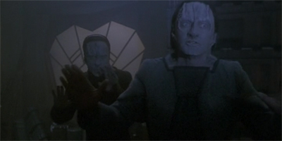 Instead, the Prophets and the Pah-Wraiths are generic one-dimensional foils. The Prophets are unequivocally good, even after the revelations about Sarah Sisko’s pregnancy in Image in the Sand and Shadows and Symbols. The Pah-Wraiths are unequivocally evil, something reaffirmed even in an otherwise nuanced episode like Covenant. The entities are even colour-coded for the audience’s convenience; the Prophets are white and blue while the Pah-Wraiths are deep red. It is stock science-fiction mysticism, drawn in crayon colours.