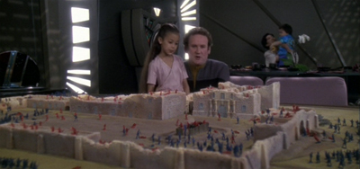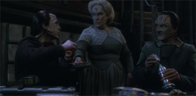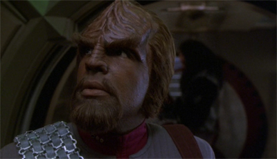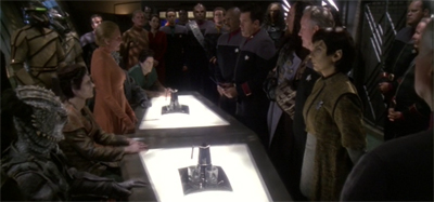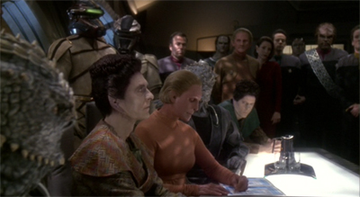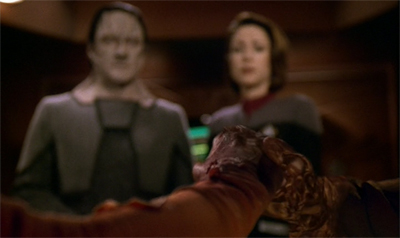 (What You Leave Behind is so caught up in its action that the production team have to recycle a lot of the battle footage from earlier episodes. Certain special effects sequences are lifted from episodes like Sacrifice of Angels, while inserts are taken from episodes like The Dogs of War and even films like Star Trek: Generations. There is a sense that budget on What You Leave Behind has been stretched to breaking point, given the impressive supporting cast and the number of sets and extras. The episode looks good, but it buckles under the limits of conventional nineties television.)