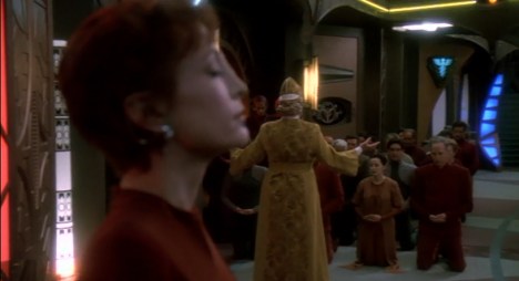 Certain other aspects of Deep Space Nine feel more timely a decade on. The self-serving arrogance of Gul Dukat in In Purgatory’s Shadow and By Inferno’s Light, couched in the trappings of crowd-pleasing nationalism that covers his betrayal of his nation, cannot help but evoke the spectre of Donald Trump and other twenty-first century right-wing nationalists. (There is even a Twitter parody account.) The introduction of the cynical and hypocritical Vedek Winn in In the Hands of the Prophets also seems particularly timely.