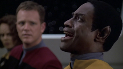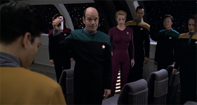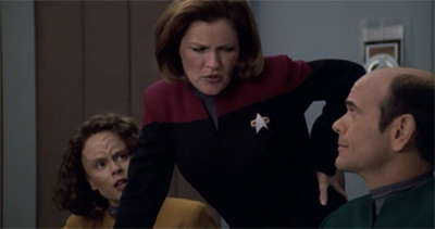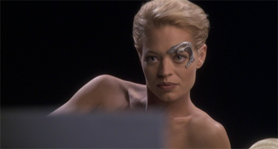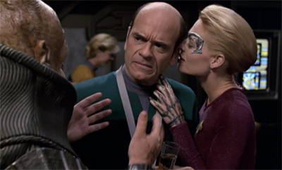 I actually like the scene, not so much for the Doctor’s perversions being witnessed by the crew, but Seven’s blase attitude to being seen naked. This comes up again with Q’s son, and in one of the interviews on youtube, Jeri Ryan mentioned that the catsuit actually became an asset, since she didn’t want Seven to look too butch. It fits with the Borg continuity (even if it still doesn’t explain why she continues to wear a catsuit after her skin has grown back), and it shows Ryan is an actor of no small talent. Saddled with a bad costume and working environment, she incorporated both into her character and strengthened the performance, which probably drove her co-stars mad.