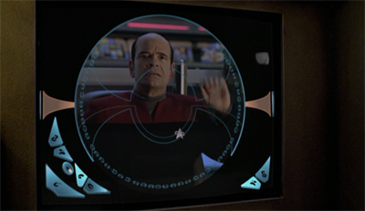 Tinker, Tenor, Doctor, Spy invites the audience to compare Phlox’s observation of the EMH as an equivalent to watching a television series. “This is my observation post,” he explains. “I have a single function. But the Doctor does much more than just practice medicine. He has access to the entire ship, and he seems to be an expert on everything. In fact, the Captain just gave him authorisation to command the bridge! It was a very exciting moment.” There is an element of voyeurism to this, as if Phlox if living vicariously through his subject.