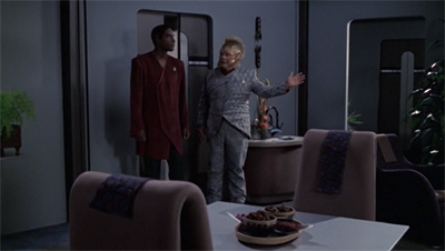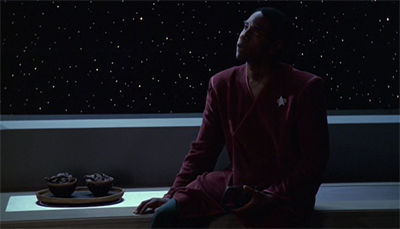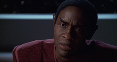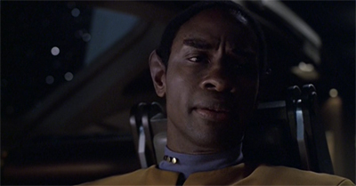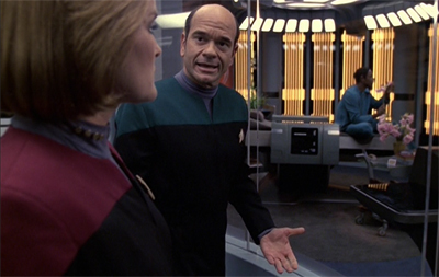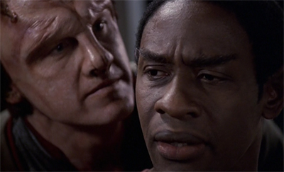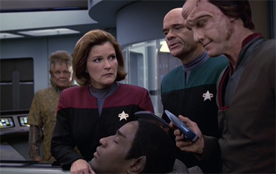 Riddles stumbles in this regard, with the episode much more invested in Neelix than Tuvok. After all, the episode seems to be more about the hard work that Neelix is doing than about the impossible situation in which Tuvok finds himself; this is most obvious from the care that Janeway and the EMH take to reassure Neelix, but even in the way that the climactic conversation between Neelix and Tuvok is structured. It is Tuvok undergoing the procedure, but it is Neelix who makes the big emotional decision.