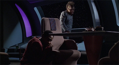 At one point midway through the episode, after his emotionally-charged conversation with Tuvok about the man that he used to be, Neelix retreats to the messhall. There he finds Seven of Nine starring out at the stars, contemplating her situation. Neelix asks her for advice, and for reassurance. “When is a Vulcan no longer a Vulcan?” Neelix wonders, contemplating how best to help Tuvok. Seven inspires Neelix by recounting how Janeway taught her to embrace her humanity following her separation from the Borg Collective.