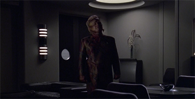There are a number of impressive shots and compositions in the episode, with Dawson making a point to give the episode an impressively cinematic style for a very dialogue-driven and conventional episode of Voyager. This is perhaps most notable in the bookending shots of Tuvok undergoing transformation; the shots of Tuvok after he has been attacked and before he undergoes his operation, the camera pulling upwards in order to give the audience a god’s-eye view of unfolding events.
