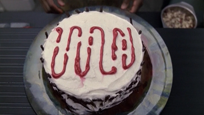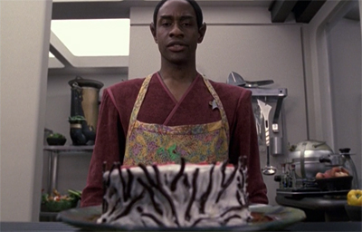 Similarly, there is an impressive reveal of the scanning frequency on the cake, a combination of a tilt with a pedestal which allows Dawson to begin the shot by looking at Tuvok and then gracefully re-position the camera so as to reveal the clue that Tuvok has drawn using the icing. This reveal could easily have been relayed through a quick cut from one relatively static position to another, but Dawson quite correctly treats the moment as one of the big emotional and plot beats within the episode.