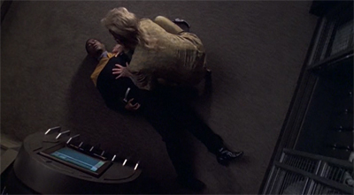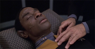 None of these earlier Tuvok-driven stories were particularly subtle, but Riddles is particularly inelegant. Tuvok is attacked by a mysterious alien creature that just so happens to scramble his neurology in such a way that his emotional barriers are broken down. As a result, Tuvok is rendered as a child, a doe-eyed innocent almost incapable of processing the world around him and overwhelmed by emotional responses that he spent a lifetime repressing – particularly “volatile ones.”