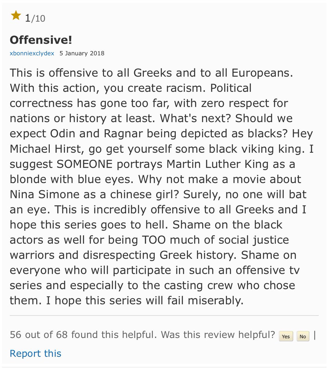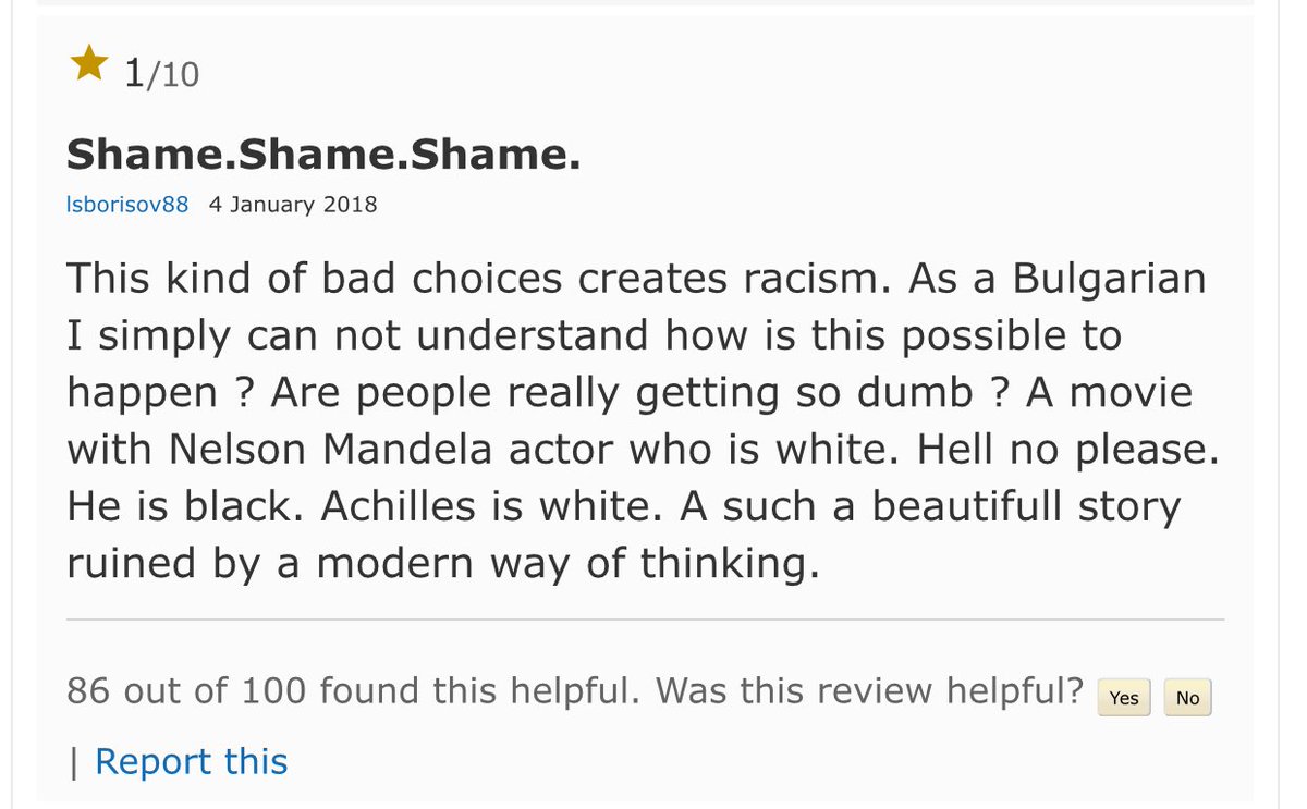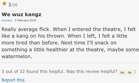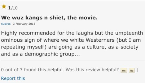 Of course, it is entirely possible that these statistics could just be anomalies. Maybe grassroots audiences don’t like Black Panther as much as critics do. However, a quick glimpse at the early user reviews for Black Panther on the Internet Movie Database suggests exactly what is motivating these scores. For those unfamiliar with racist memes and dogwhistles, “we wuz kangs” is a derogatory dismissal of attempts by African Americans to connect with their heritage, to dismiss any connection to the continent and the contrast between their ancestors who lived there and those most likely taken as slaves.