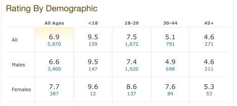 The demographics of this vote are informative. By February 7th, more than 5,800 people had voted for Black Panther. The staff working at the Internet Movie Database and younger voters had rated it quite highly, although those numbers were comparatively low; numbers that seem plausible for a film not yet in wide release. However, going by these figures, a lot of older men had seen it. And a lot of these older men had a strong negative reaction to it. The contrast in scores is striking, and well outside of what one might expect for standard deviation. By February 9th, that number (and the polarisation) had increased.