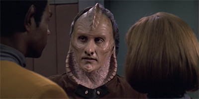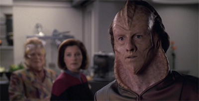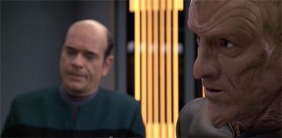 As soon as I heard “the demon with the golden voice”, I knew we were in for a Cardassian remix. And why not? Voyager has recycled from TNG before. Some of them have been duffers, others improved upon the original concept.