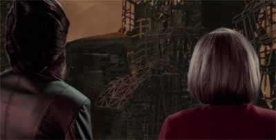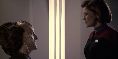 Basics, Part I and Basics, Part II feel very much in keeping with the two-part structure that Piller established on The Next Generation with The Best of Both Worlds, Part I and The Best of Both Worlds, Part II, two-part stories consciously built around the central cliffhanging image designed to bring the audience back for the next episode. Even those Next Generation two-parters that didn’t build themselves around the cliffhanger image were still easily divided into two units of narrative; Chain of Command, Part IChain of Command, Part II, Birthright, Part I and Birthright, Part II were all distinct episodes.