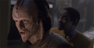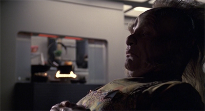 Similarly, Gedrin’s character arc is also truncated. His early scenes foreshadow the revelation that the Vaadwaur are a dangerous race of nationalist warmongers. “Jisa and I lived there in the old quarter,” he reflects. “We had a garden overlooking the street below. It’s a shame she didn’t show more courage at the end.” When Voyager manages to disable a Turei ship, Gedrin urges them to press the advantage. “One more torpedo will finish them.” In the opening acts, Gedrin’s character is defined in such a way as to assure viewers that waking the Vaadwaur would be a very bad idea.