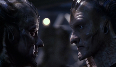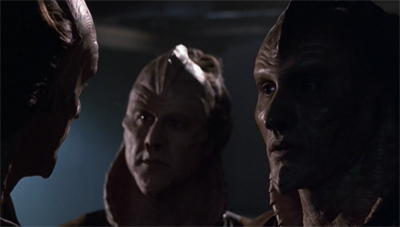 However, the Vaadwaur are very consciously designed to look like lizards. Their neck ridges do not curve inwards like those on Cardassians, instead flaring (and curving) outwards. The lighter colouring on the inside of this collar evokes the hood of deadly snakes like vipers or cobras. Although they do not have scales, their skin appears to glisten, suggesting the slickness associated with snakes. The Vaadwaur belong to a rich pulp history of lizard-like aliens, such as the Visitors from V or the Sleestak from Land of the Lost.