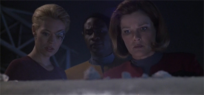 However, the Vaadwaur fall flat in large part because Dragon’s Teeth as a whole falls flat. A lot of the plotting in the episode feels strange, as if cobbled together from a variety of different ideas and reference points. Indeed, several of the episode’s plot points feel lifted from other event episodes without any real justification. The subspace corridors recall the promise of a shortcut home in Dark Frontier, Part I and Dark Frontier, Part II. Indeed, the idea of using advanced technology to shave years off the journey was a feature of other “event” episodes like Hope and Fear or Timeless.