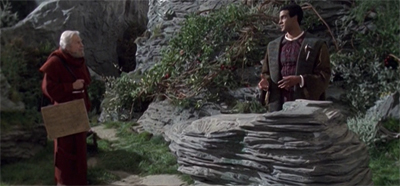 Even beyond the clever concept of showing the same view across four different time periods, these vignettes from the planet surface have an appealingly archetypal quality. The characters are all very broad, with Kelemane, Gotana-Retz and Trina receiving names. The characters talk in very generic terms about their world, so as not to confuse audience members with overly-specific back story. The scenes set on the planet surface are consciously heightened, having that abstract theatrical quality that defines so much of Star Trek.