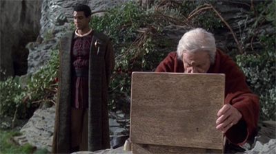 Blink of an Eye uses the same location in its establishing shots of the planet surface, while acknowledging that those shots are set centuries apart. Blink of an Eye fixes its perspective in space, but not in time. As a result, the audience gets to watch a snapshot slideshow of the evolution and development of this culture, the growth of the community from a few scattered huts to a castle to an observatory to a science-fiction future. It is very confident and very assured televisual storytelling, remarkable given that Voyager was usually quite conservative in such matters. It recalls the montages in Counterpoint.