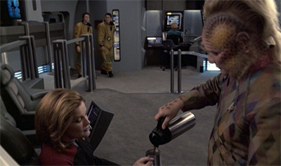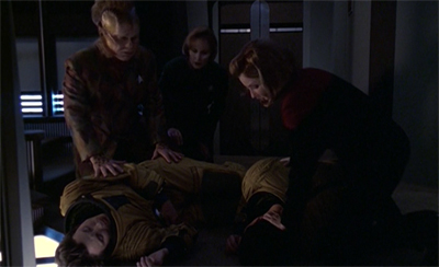 It is not merely that time moves slower on Voyager, it is that Voyager exists outside of time. The introduction of time to Voyager is seen as something dangerous, an idea that is repeated at several points over the course of these final seasons; the return of an aged Kes in Fury and the fracturing of the ship’s timeline in Shattered. Indeed, the sight of Trina and Gotana-Retz collapsing on the bridge suggests that of fish that have jumped out of water. There is a sense that there is some vital element of their existence that is sorely lacking on Voyager.