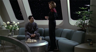 This idea is reinforced by the small arc focusing on the EMH, who is absent from Voyager for only a few minutes, but lives an entire life on the planet surface. Making passing reference to “Mareeza”, the EMH elaborates, “She was my roommate. Three years is a long time, Captain. One needs companionship.” In a later conversation with Gotana-Retz, the EMH reveals that he started a family on the planet surface, and that his descendants might live on. The EMH does not reveal any of this to his crew mates. They would not understand. They exist outside of the flow of time.