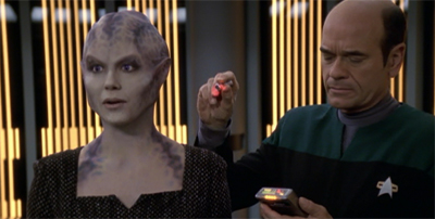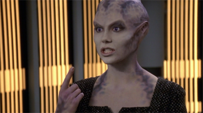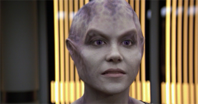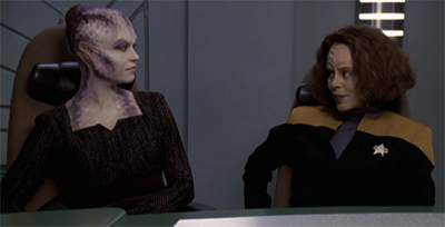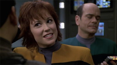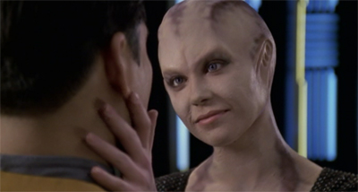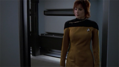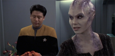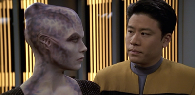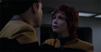 In [Wilkerson’s] original story, two of the crew members who died in the pilot episode of Voyager – I believe the original doctor and the original helmsmen — return. We thought they had been dead for six years, but they actually were re-animated. It was a little tough to buy, because we have certainly tried to paint on the show that it’s tough to get through the Delta Quadrant. To make the time issues a little more believable. I think we said Lyndsay was gone two or three years. Ultimately we were just happy to make it a Kim story and invent this person who was very important to him several years ago.