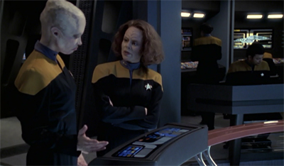 This sculpture class recalls a scene from Raven, in which Janeway attempts to kindle Seven’s creativity by inviting her to help with a bust the Captain is sculpting. Janeway lectures Seven on the importance of art in the liberation of the imagination and, by implication, the nurturing of individuality. Significantly, this lesson takes place in Janeway’s holodeck simulation of Leonardo da Vinci’s workshop and in the context of all that it signifies in terms of Renaissance humanism. But the Captain fails to get through to Seven, who finds sculpture without utility and hence irrelevant. Now, however, two years later, Seven’s decision to include sculpture in the Borg children’s curriculum suggests that perhaps Janeway’s lesson had not gone unlearned at all.