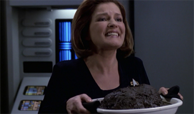 How can a replicator burn a pot roast? Is this supposed to be funny? It’s just confusing. Janeway then eats crappy white Wonderbread. I kept waiting for her to replicated a Diet Pepsi, a Twinkie, and some cigarettes to go with the meal. The writers find any way to connect the show to the 20th century, preferably the 50s.