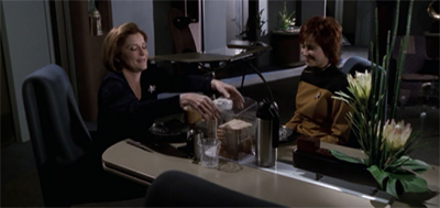 To be fair, Ballard does get at least one great line. After Janeway burns her pot roast, she explains to Ballard that Tuvok has produced a list of plans to repel a possible Kobari attack, Ballard snarks, “Did he include your pot roast?” It’s a witty one-liner, one that seems almost like something from Buffy: The Vampire Slayer or The X-Files or some other more contemporary nineties television series. Unfortunately, Ballard never manages to maintain that level of wit across the episode’s runtime, and instead feels like a parody of a more modern television character. (This is most obvious in the way she “messes” her quarters.)